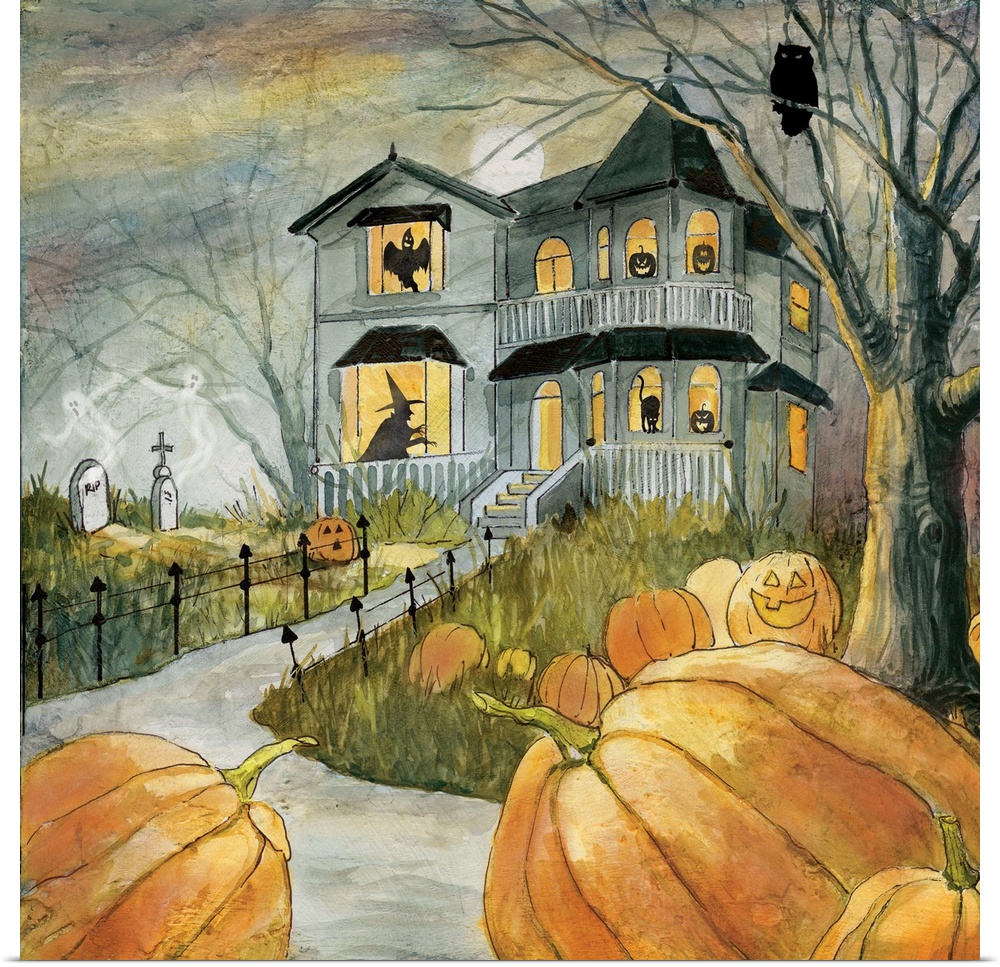 <p>A spooky haunted house with figures in the windows surrounded by pumpkins.</p>
