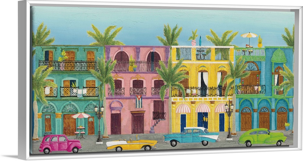 <p>Horizontal contemporary painting of colorful buildings in Havana with vintage cars parked out front.</p>