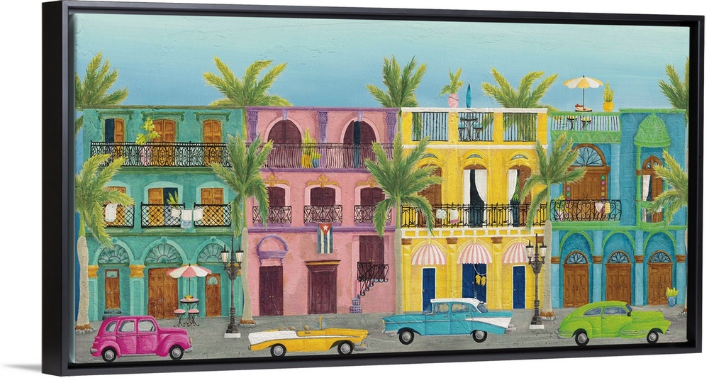 <p>Horizontal contemporary painting of colorful buildings in Havana with vintage cars parked out front.</p>