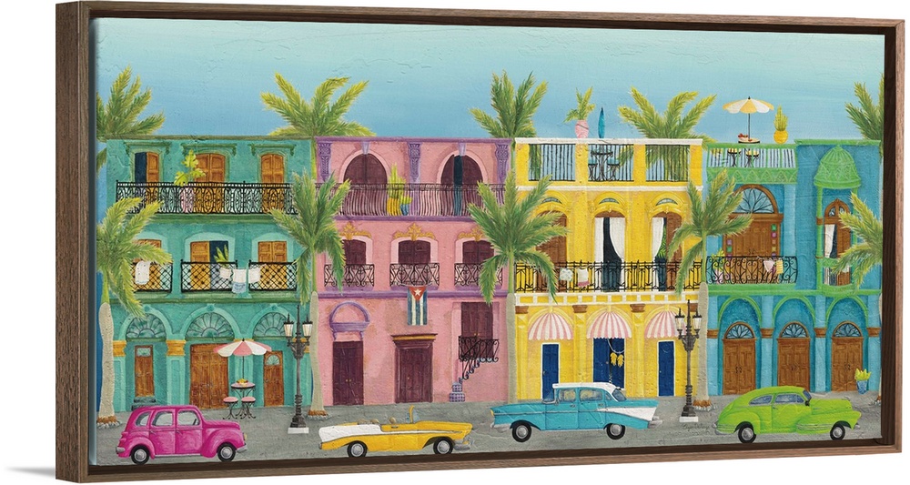 <p>Horizontal contemporary painting of colorful buildings in Havana with vintage cars parked out front.</p>