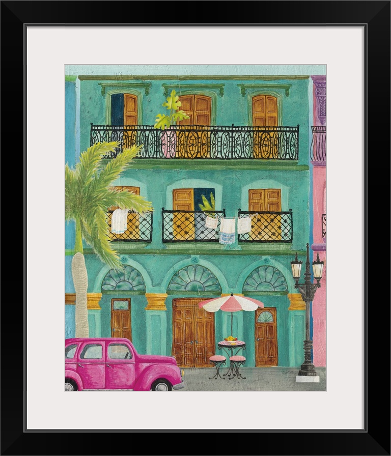 <p>Vertical contemporary painting of a colorful teal building in Havana with a pink vintage car parked out front.</p>