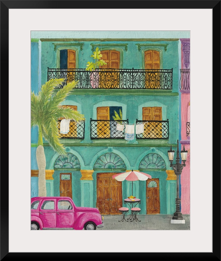 <p>Vertical contemporary painting of a colorful teal building in Havana with a pink vintage car parked out front.</p>