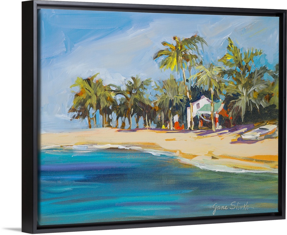 <p>Contemporary painting of a sandy Cuban coastline with several palm trees, a beach house, and a boat.</p>