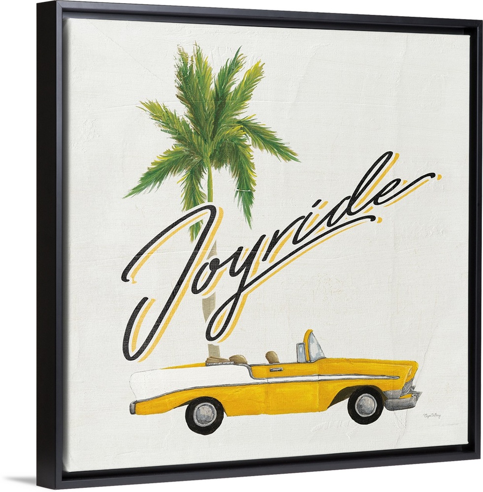 <p>Square contemporary design of a classic car and palm tree with the text "Joyride".</p>