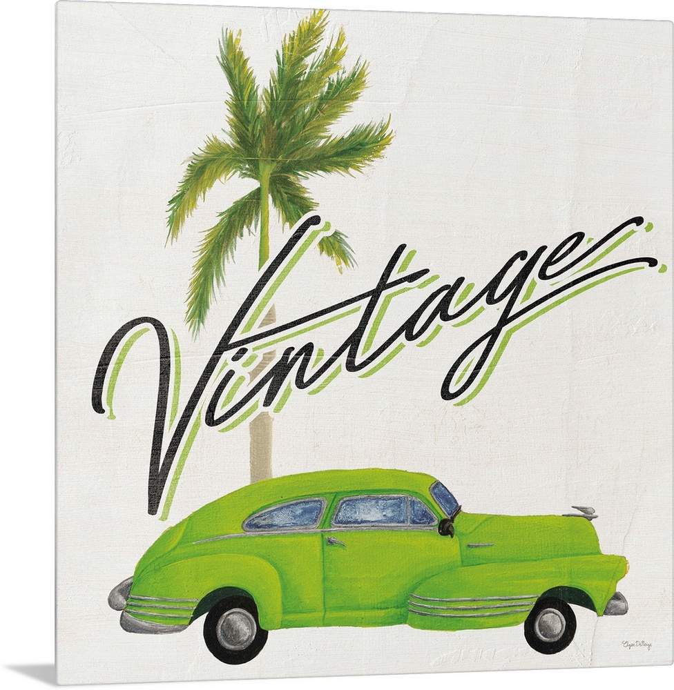 <p>Square contemporary design of a classic car and palm tree with the text "Vintage".</p>