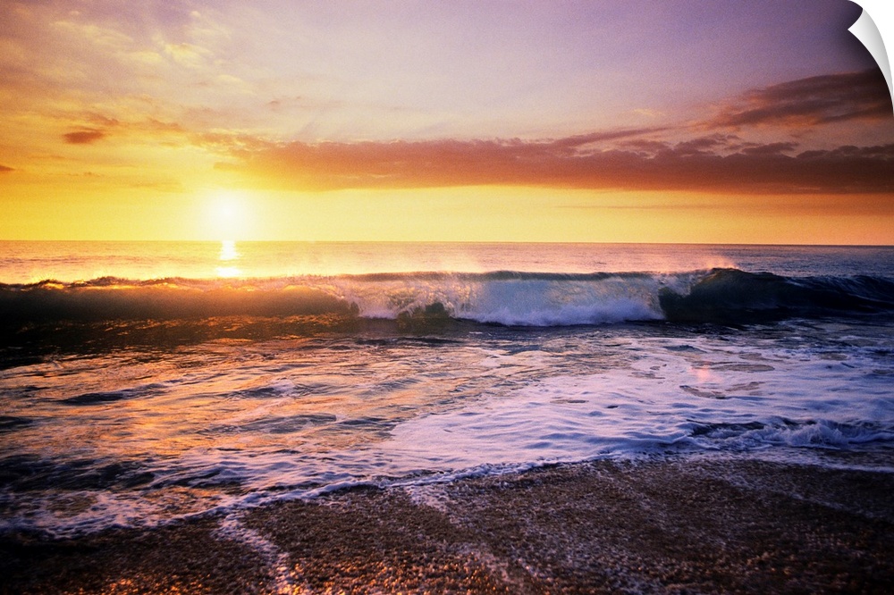 <p>The sun is setting in the distance over the ocean as a wave begins to crash near the edge of the water.</p>