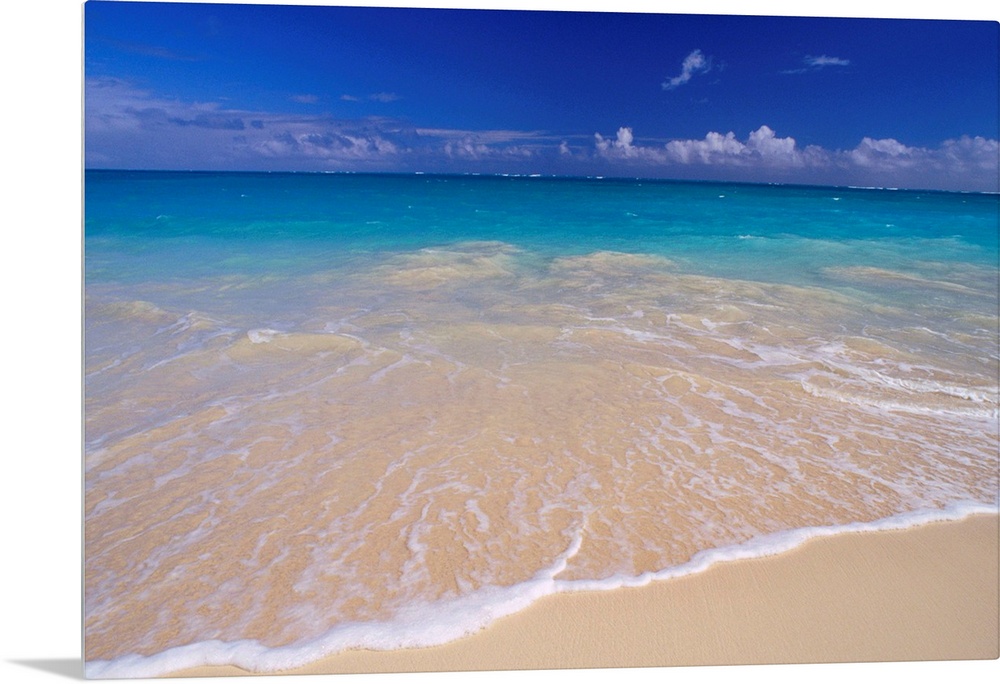<p>Wall docor of clear ocean water washing ashore a white sanded beach.</p>