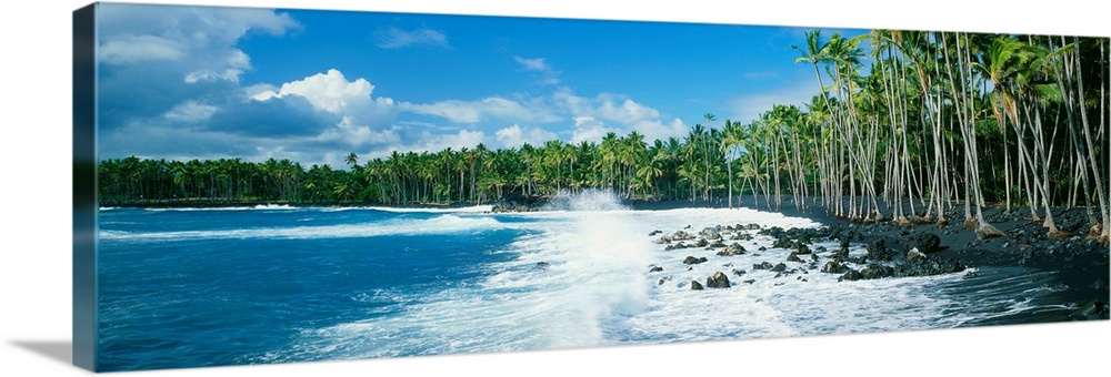 <p>A large panoramic view of the coast of Hawaii with palm trees lining the dark sand and waves crashing onto the rocks.</p>