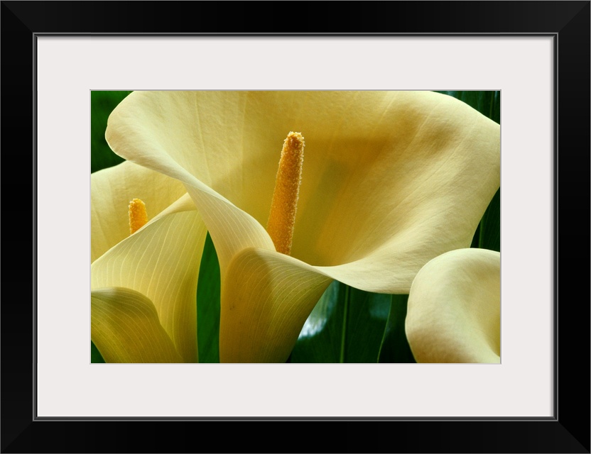 <p>Large calla lilies are photographed very closely to show the detail of the petals and center.</p>