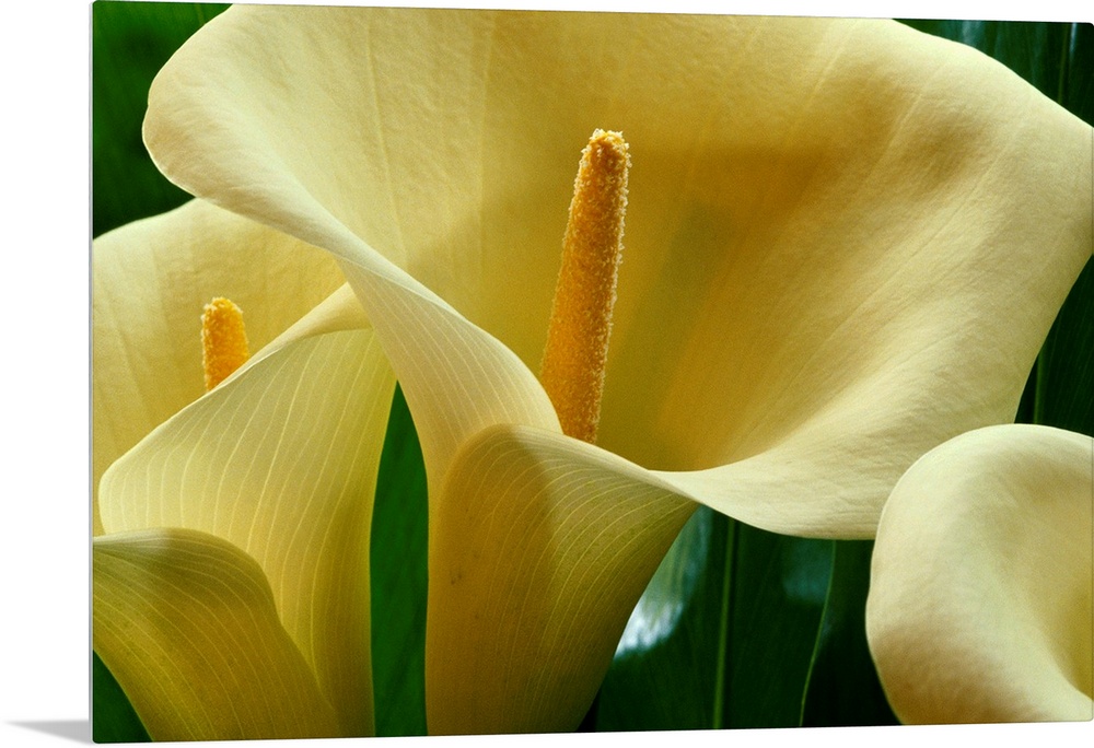 <p>Large calla lilies are photographed very closely to show the detail of the petals and center.</p>