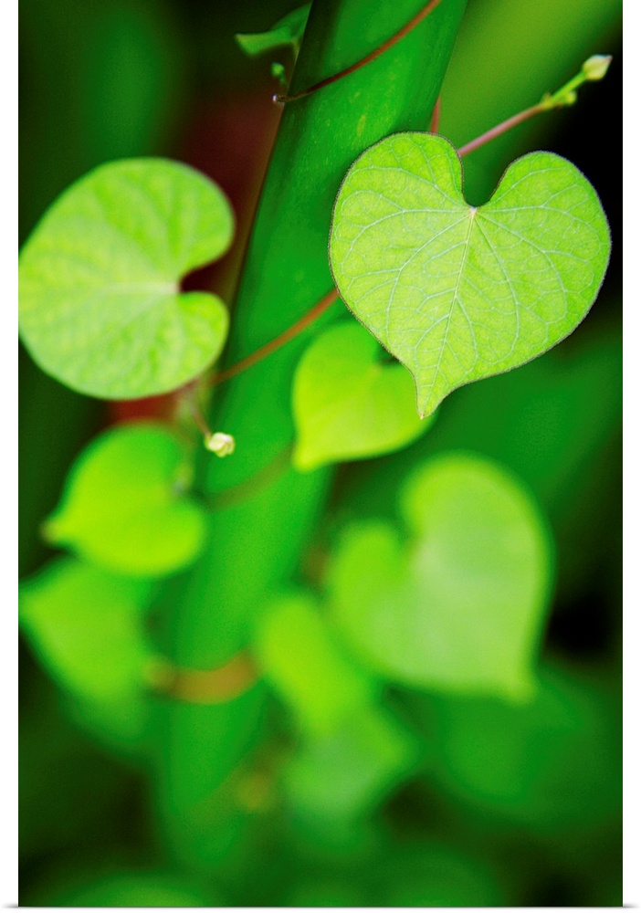 <p>Macro shot of heart-shaped leaves on a vine curling around a stem, increasing in focus as they climb.</p>
