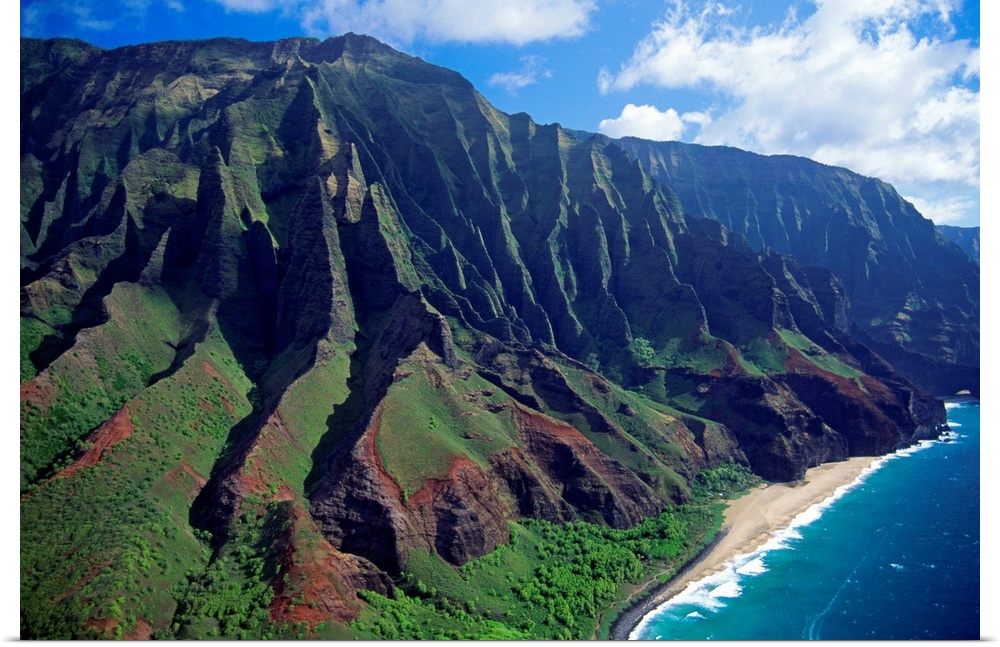 <p>This large piece is an aerial photograph of huge mountains on the coast of a Hawaiian island.</p>