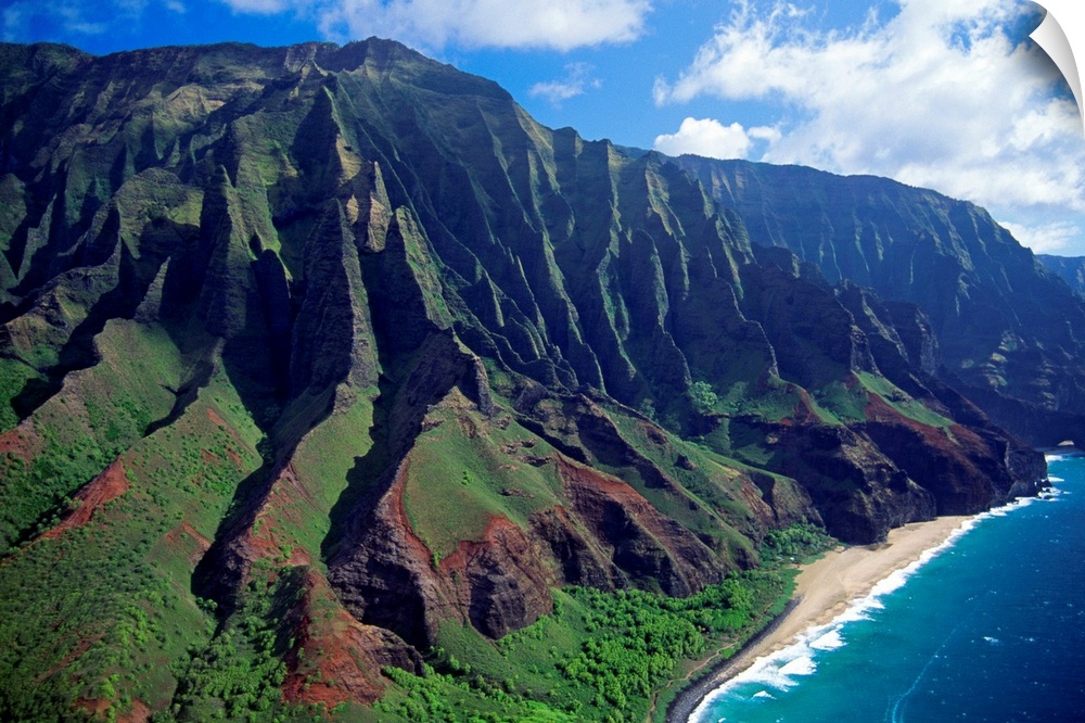 <p>This large piece is an aerial photograph of huge mountains on the coast of a Hawaiian island.</p>