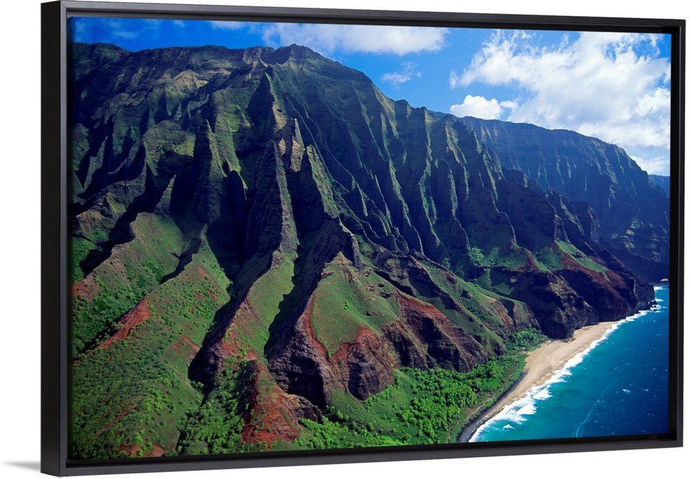 <p>This large piece is an aerial photograph of huge mountains on the coast of a Hawaiian island.</p>