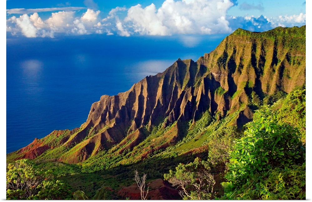 <p>This is a landscape photograph of mountain cliffs on a view down a hillside to the ocean and cumulous clouds on the horizon.</p>
