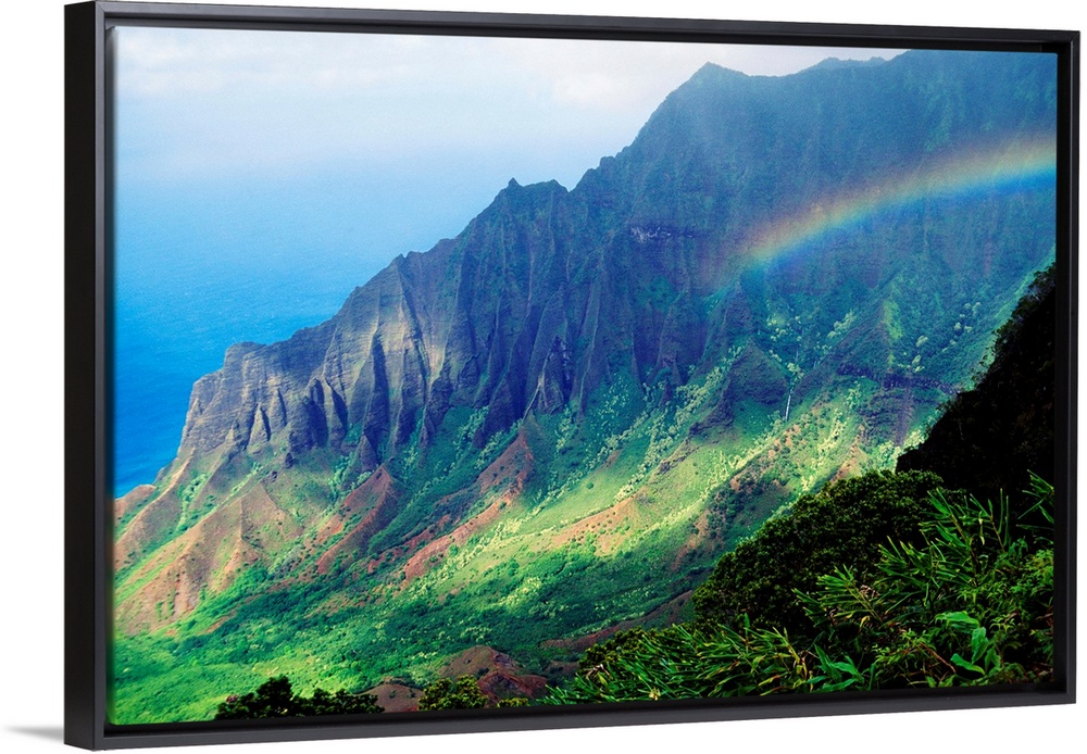 <p>Large canvas photo art of a rainbow in the middle of lush Hawaiian mountains.</p>