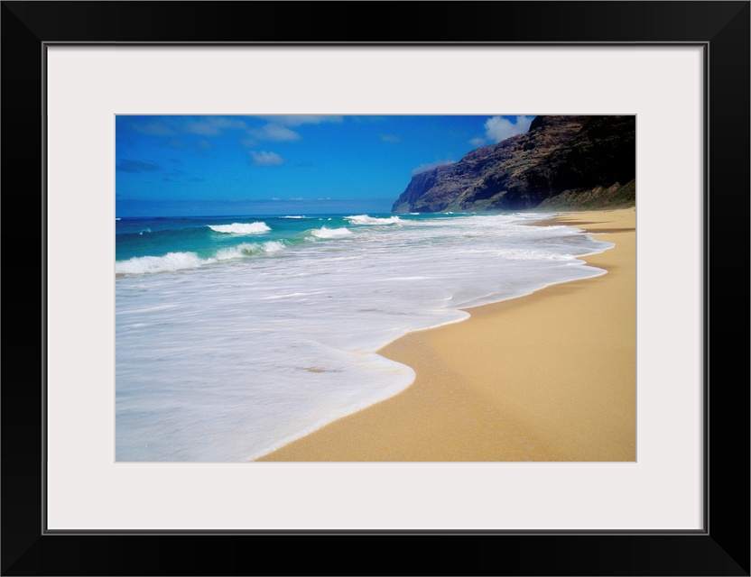 <p>Horizontal, oversized photograph of the shoreline at Polihale Beach in Kauai, Hawaii. A cliff and the Napali Coast are in the distance, beneath a blue sky.</p>