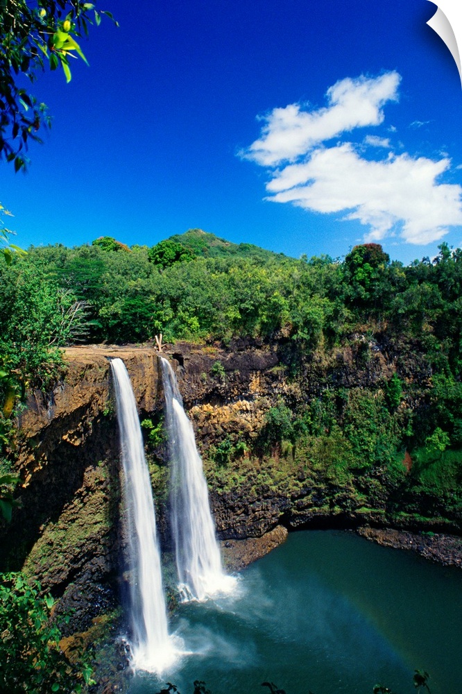 <p>Tall canvas of two waterfalls right next to each other sending water down to the lake below in Hawaii.</p>