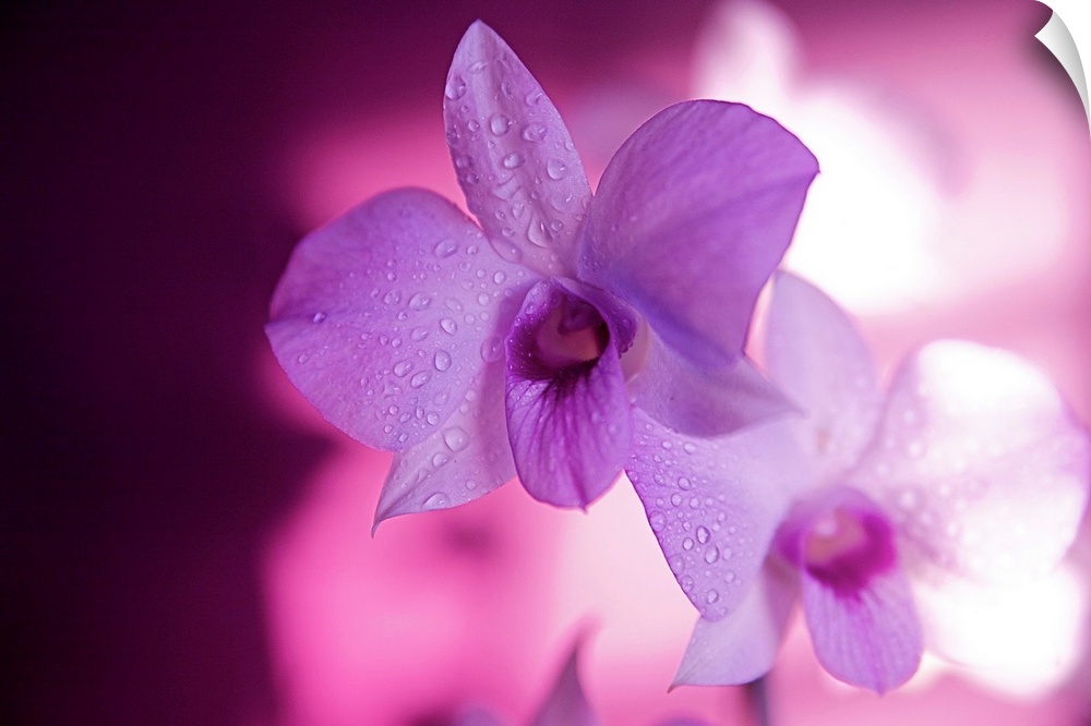 <p>Large landscape photograph of two orchids covered with small dew drops, in front of a slightly blurred background with several more flowers.</p>