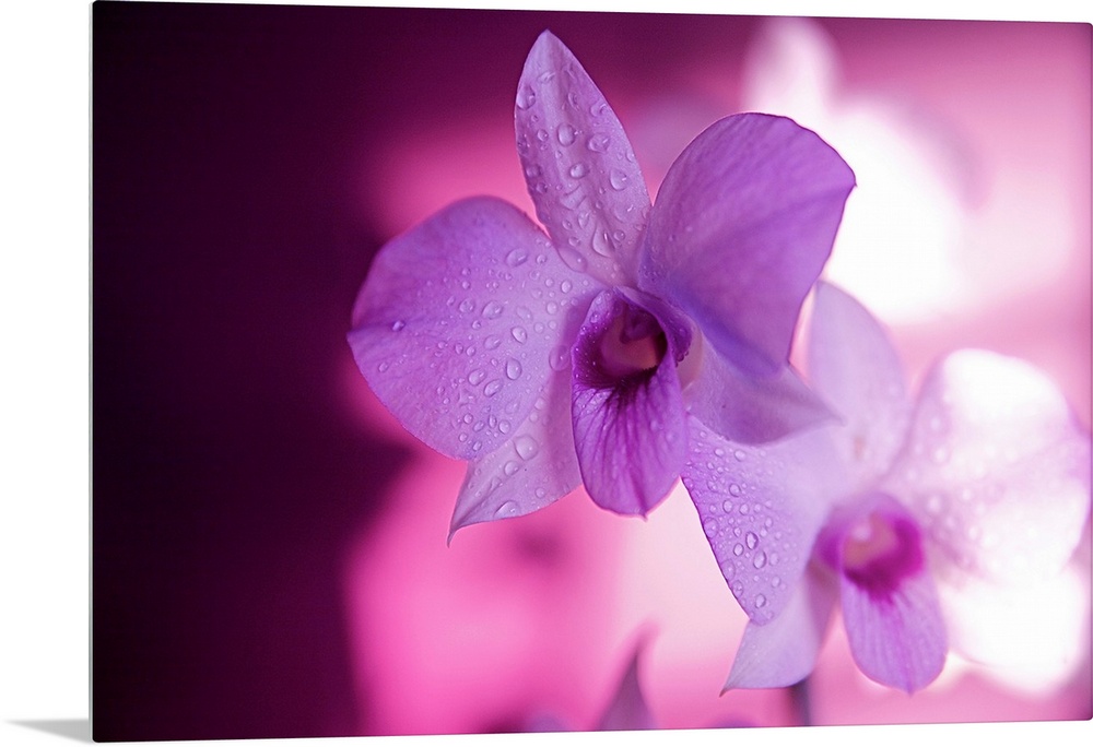 <p>Large landscape photograph of two orchids covered with small dew drops, in front of a slightly blurred background with several more flowers.</p>