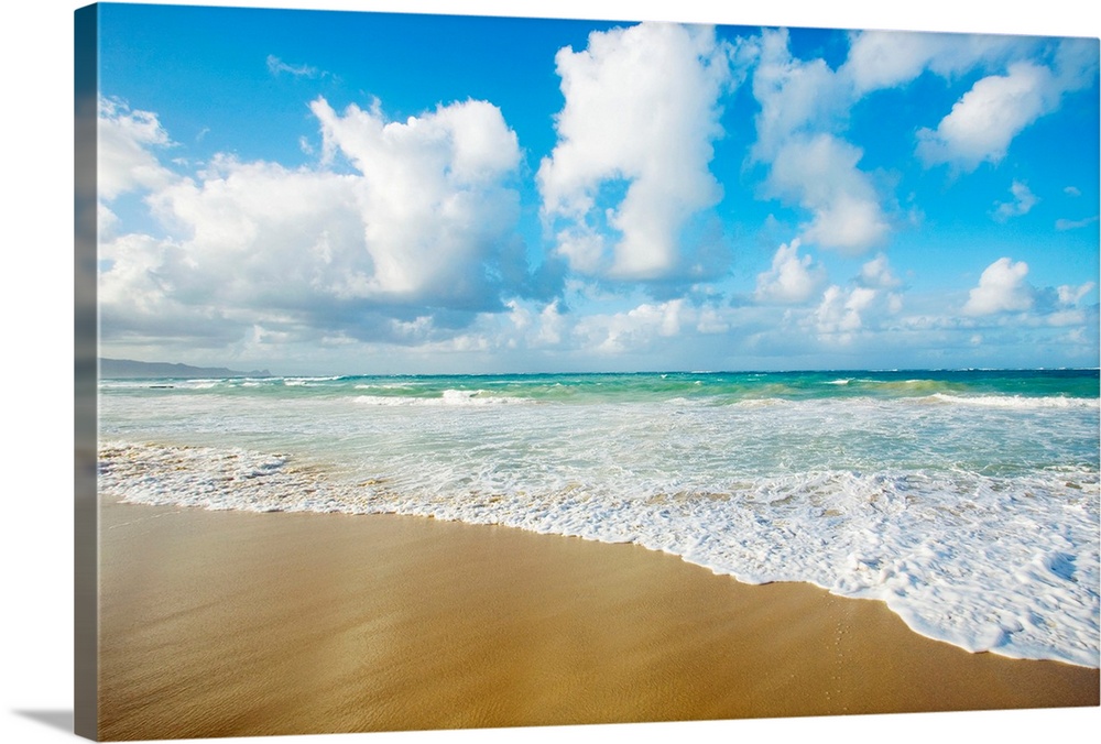 <p>A breathtaking view of the ocean from the sands in Hawaii with large white clouds above.</p>
