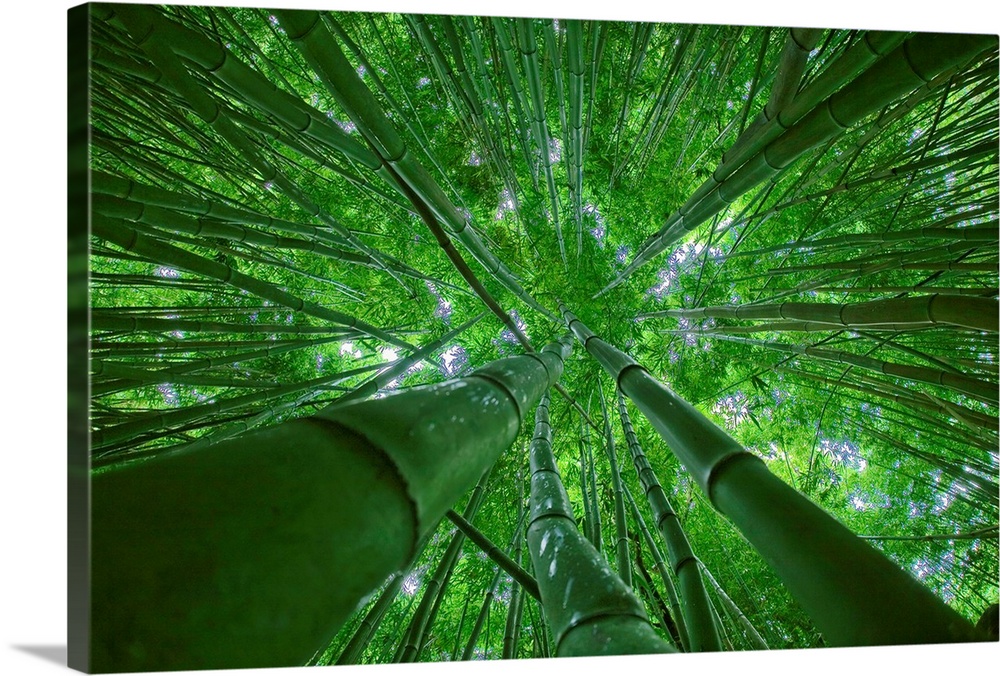 <p>Giant photograph taken from the ground looking up at a dense group of bamboo trees on an island in the Pacific Ocean as they extend towards the sky and block the majority of sunlight.</p>