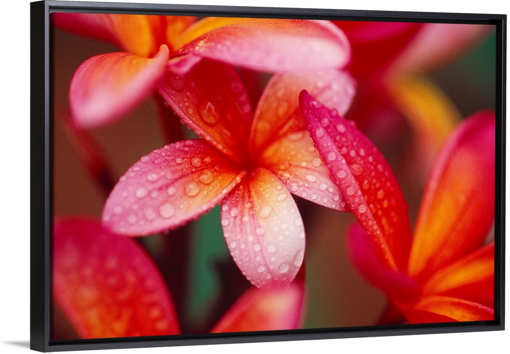 <p>Landscape, close up photograph of several vibrant plumeria flowers covered in small droplets of water.</p>