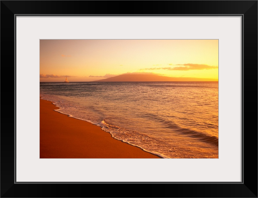 <p>The sun sets out of view over a Hawaiian coast as the ocean water rushes up on the sand and there is a view of a single sail boat in the distance.</p>