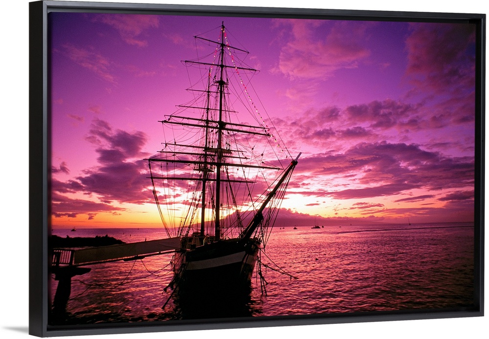 <p>Landscape photograph of a silhouetted Carthaginian ship in the waters of Lahaina Harbor, beneath a vibrant sky as the sun sets on the horizon in Maui, Hawaii.</p>