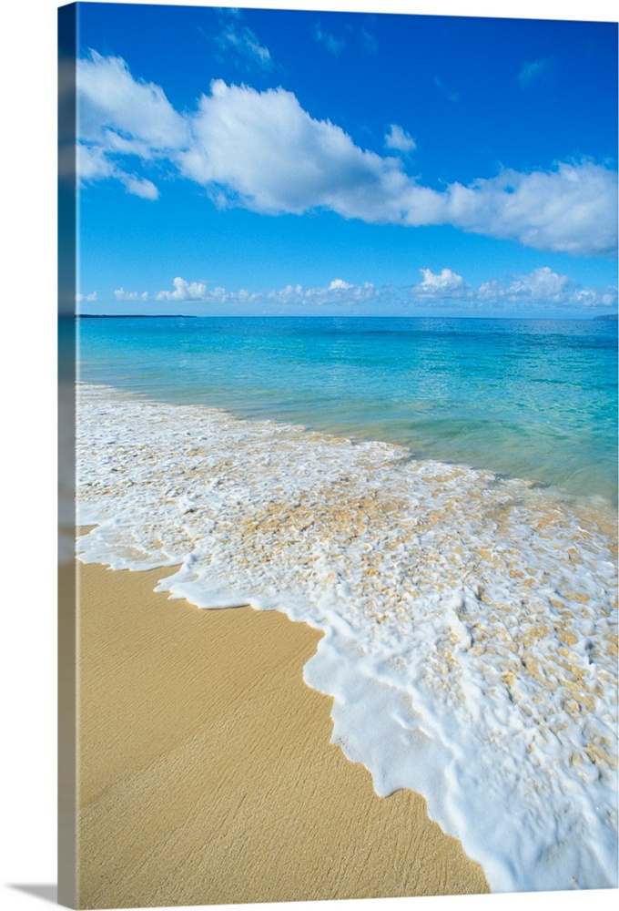 <p>Crystal clear ocean water rushes up onto the sand on a Hawaiian beach with large clouds hanging over.</p>