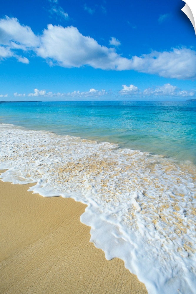 <p>Crystal clear ocean water rushes up onto the sand on a Hawaiian beach with large clouds hanging over.</p>
