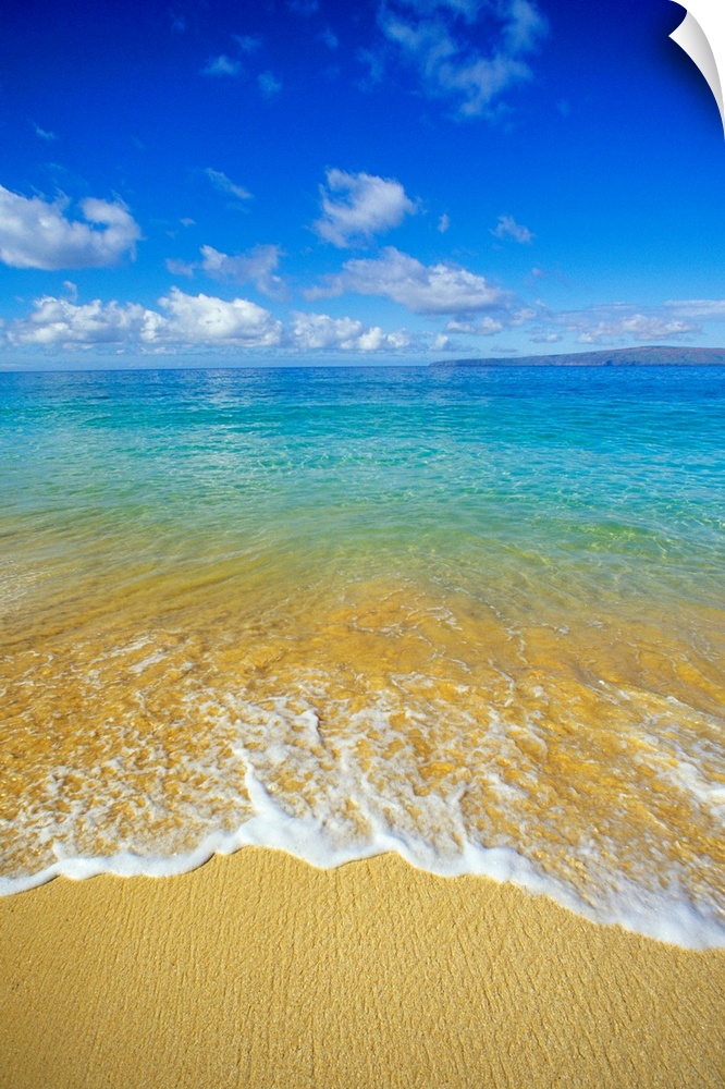 <p>Vertical photograph taken from the beach as water rushes upon it and a view out toward the vast clear ocean under a cloud filled sky.</p>