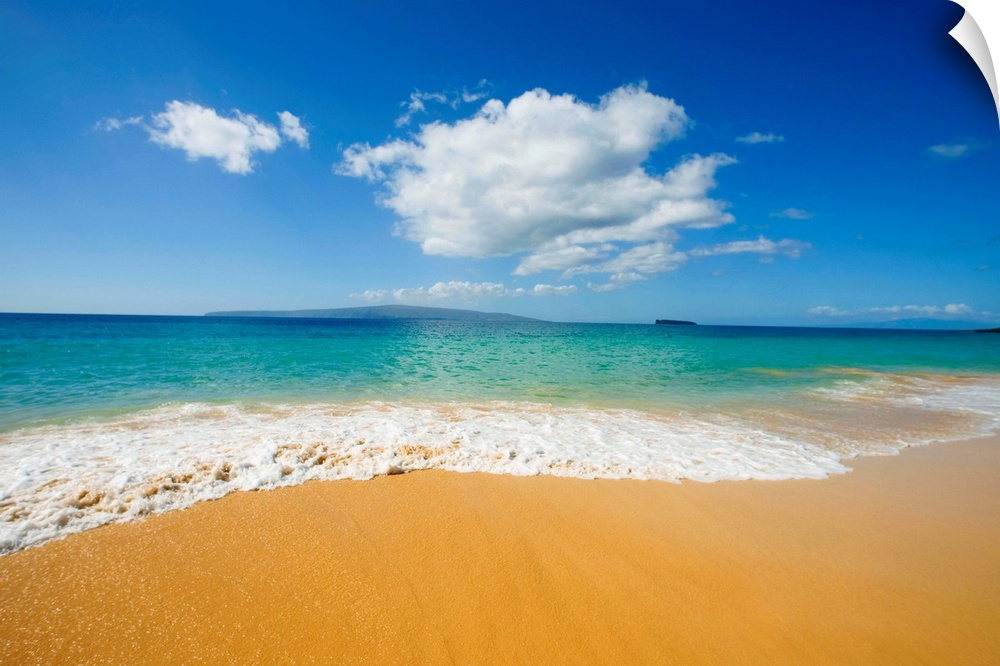 <p>The vast teal ocean rushes upon the sand and there is a beautiful view of a distant island under a large cloud in the sky.</p>