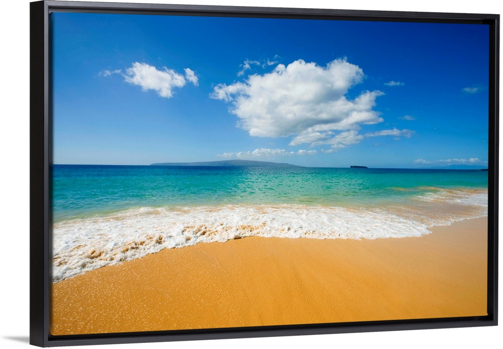 <p>The vast teal ocean rushes upon the sand and there is a beautiful view of a distant island under a large cloud in the sky.</p>