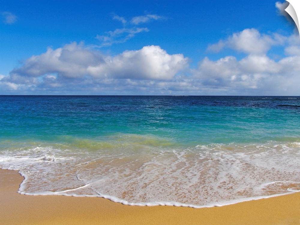 <p>Photograph of ocean washing up onto beach creating sea foam under a cloudy sky.</p>