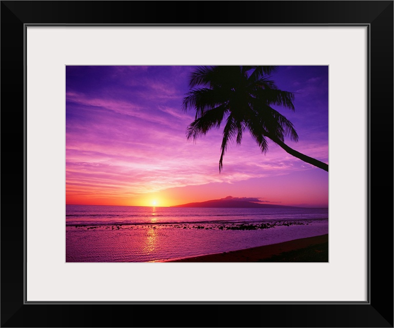 <p>Huge photograph shows the sun as it begins to set over a group of islands found within the Pacific Ocean. In the foreground there is a tall tropical plant hanging over a sandy beach and watching the soft waves of the ocean creep up the shore.</p>