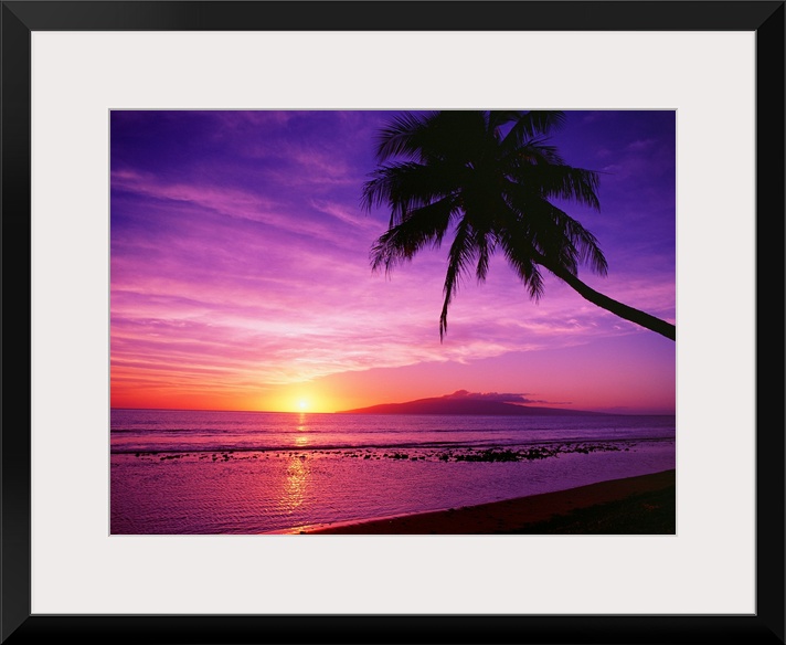 <p>Huge photograph shows the sun as it begins to set over a group of islands found within the Pacific Ocean. In the foreground there is a tall tropical plant hanging over a sandy beach and watching the soft waves of the ocean creep up the shore.</p>