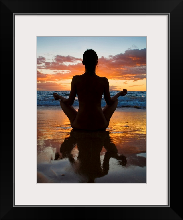 <p>Woman meditating and doing yoga on the wet sand as the surf breaks in front of her and the sun setting creating a silhouette of her body.</p>