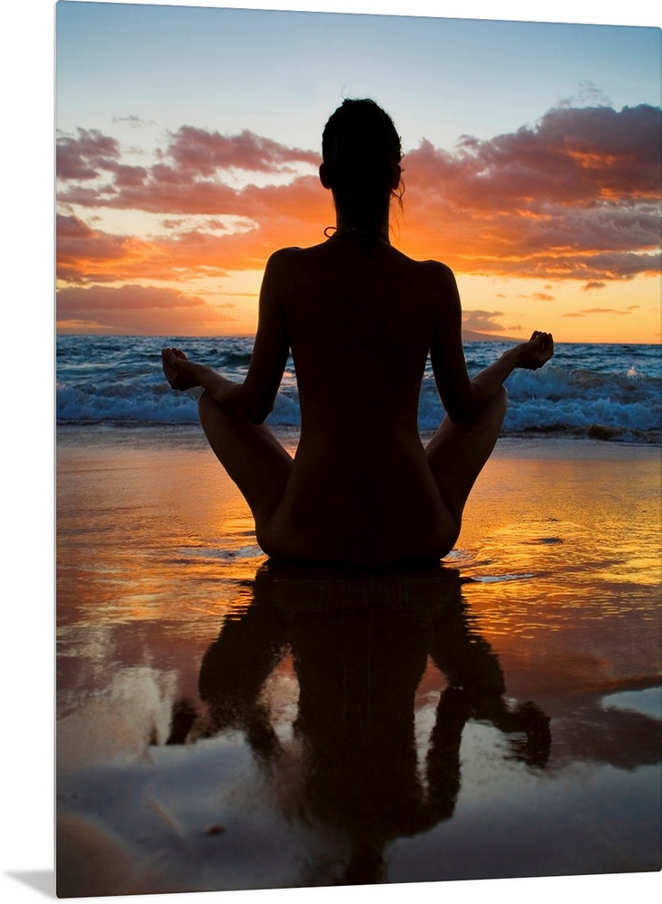 <p>Woman meditating and doing yoga on the wet sand as the surf breaks in front of her and the sun setting creating a silhouette of her body.</p>