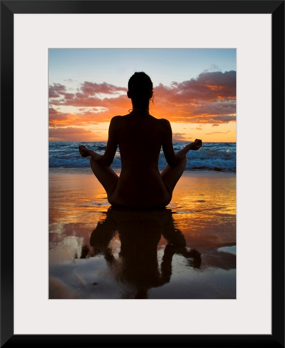 <p>Woman meditating and doing yoga on the wet sand as the surf breaks in front of her and the sun setting creating a silhouette of her body.</p>
