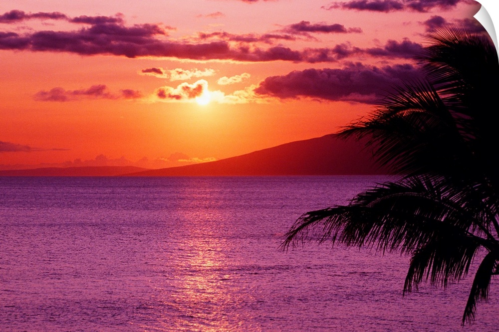 <p>Big canvas photo of a peaceful beach sunset with a silhouette of a palm tree in the foreground to the right.</p>