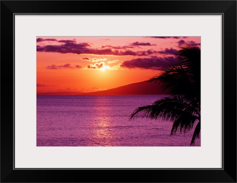 <p>Big canvas photo of a peaceful beach sunset with a silhouette of a palm tree in the foreground to the right.</p>