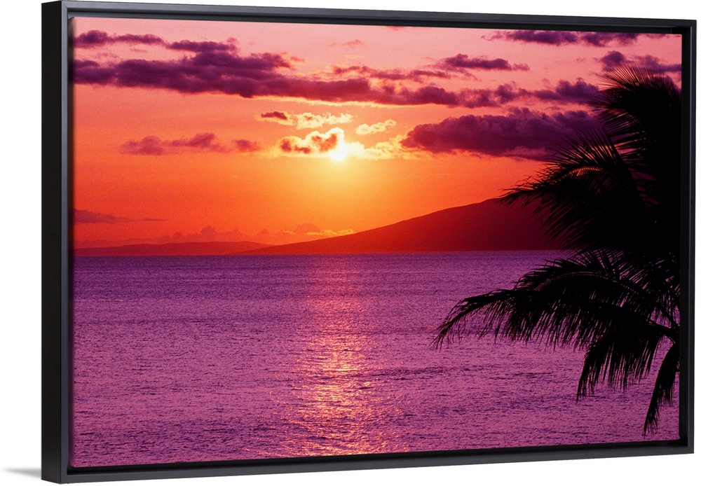 <p>Big canvas photo of a peaceful beach sunset with a silhouette of a palm tree in the foreground to the right.</p>