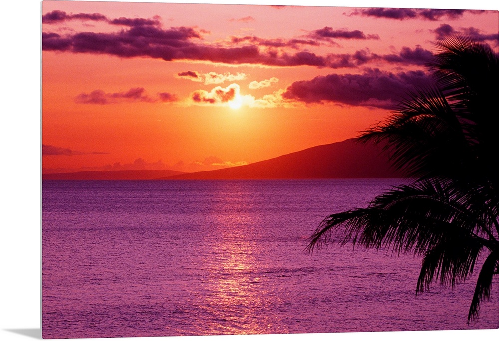 <p>Big canvas photo of a peaceful beach sunset with a silhouette of a palm tree in the foreground to the right.</p>