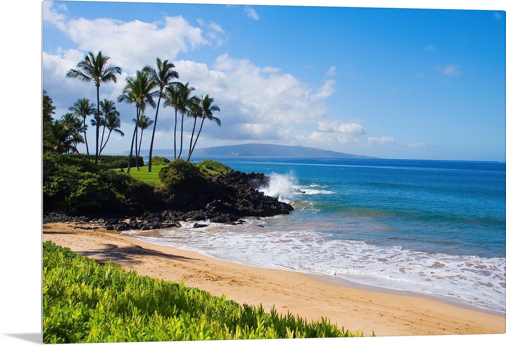 <p>An idyllic photograph of the Hawaiian coast, with gently lapping water under a bright blue sky. This inviting scene is the perfect choice for anyone who enjoyed their tropical vacation, or wishes they were about to embark on one.</p>