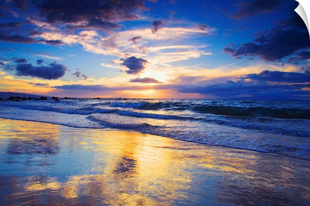 <p>Horizontal photograph on a large wall hanging of a vivid sunset glowing through clouds, over the shore of Mokapu Beach in the resort community of Wailea in Maui, Hawaii.</p>