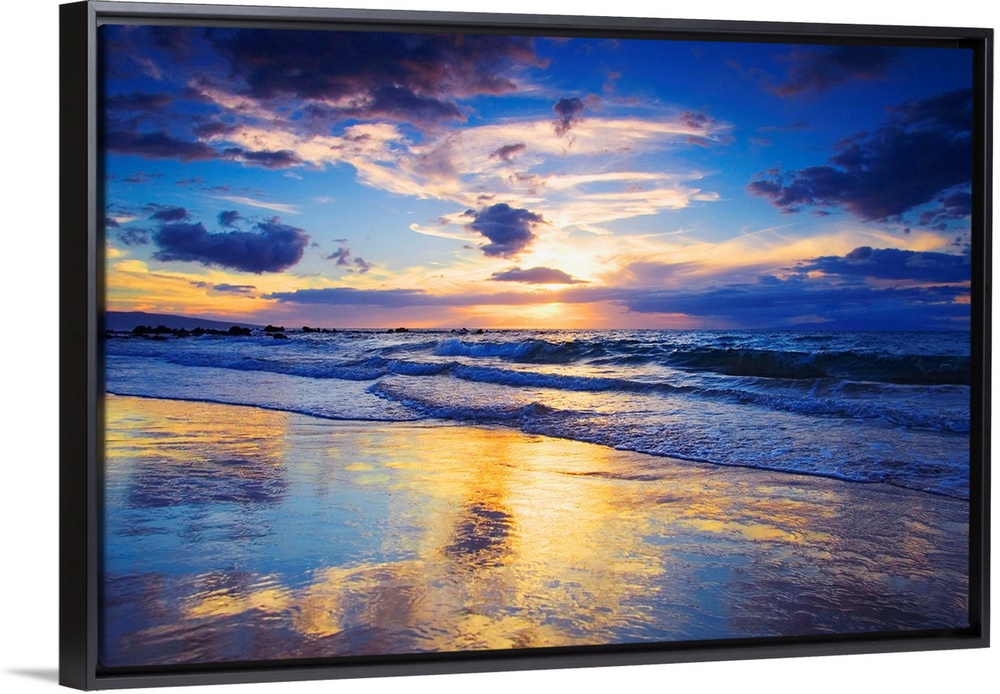 <p>Horizontal photograph on a large wall hanging of a vivid sunset glowing through clouds, over the shore of Mokapu Beach in the resort community of Wailea in Maui, Hawaii.</p>