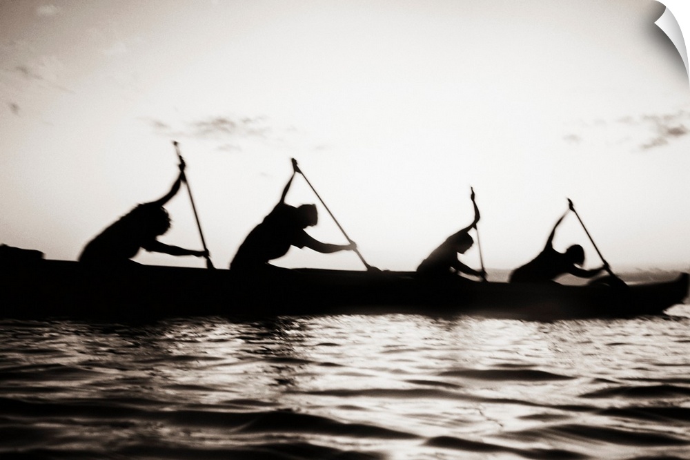 <p>Hawaii, Molokai To Oahu Canoe Race, Paddlers Silhouetted At Sunset (Black And White Photograph).</p>