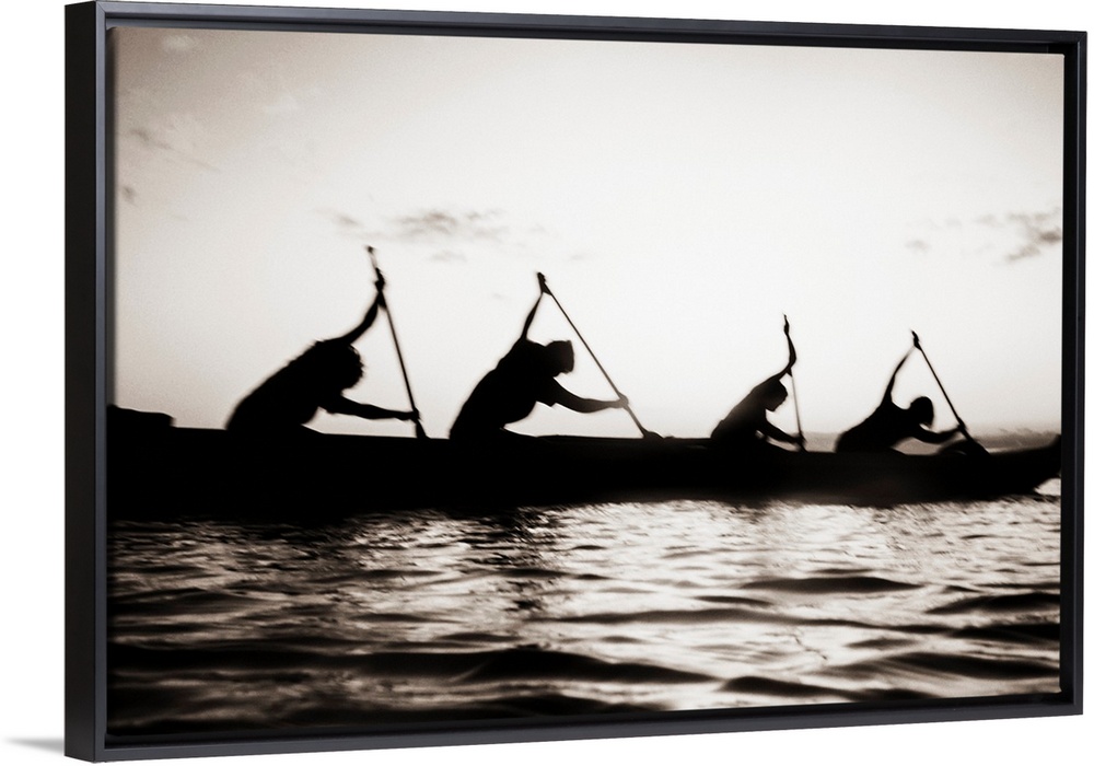 <p>Hawaii, Molokai To Oahu Canoe Race, Paddlers Silhouetted At Sunset (Black And White Photograph).</p>