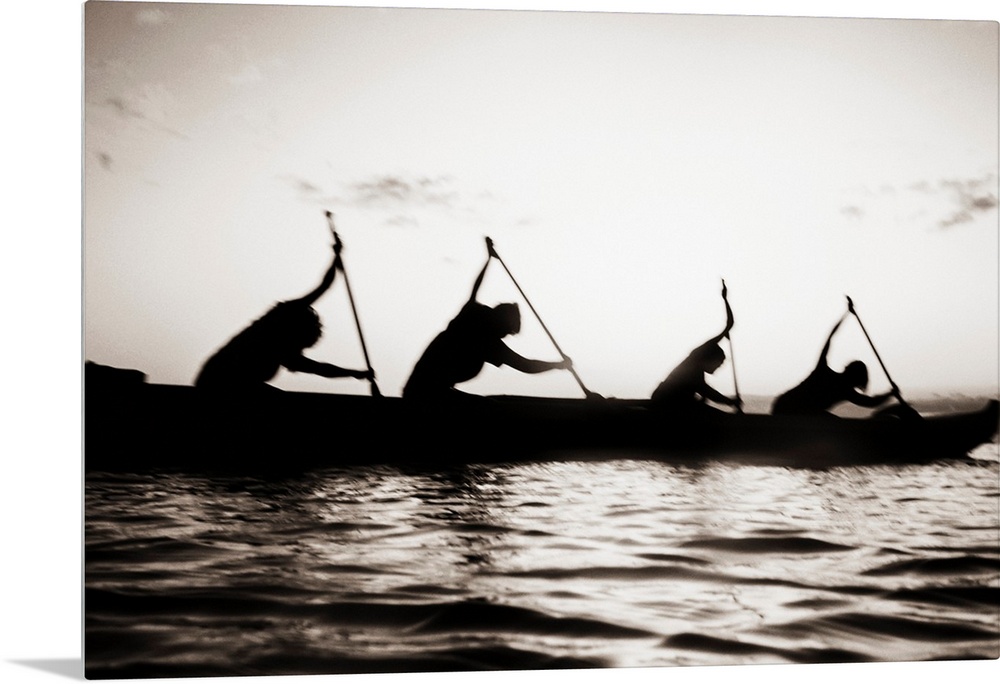 <p>Hawaii, Molokai To Oahu Canoe Race, Paddlers Silhouetted At Sunset (Black And White Photograph).</p>